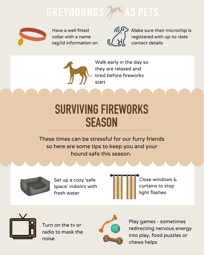 Does your hound need extra support? Are they showing continued signs of stress, such as diarrhoea, urination in the house and reduced appetite, sometime after fireworks have finished? Speak to your vets. This could be another underlying cause of their anxiety.